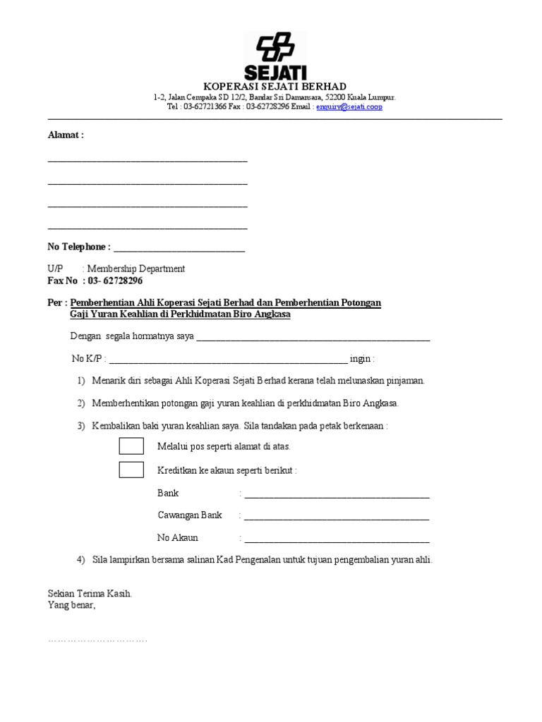 Contoh surat pemberhentian ahli koperasi. Agar premium bayaran sebanyak rm19737 tidak lagi dipotong dari sistem potongan gaji angkasa spga saya bermula dari tarikh surat ini. Potongan dalam slip gaji melalui biro angkasaapakah prosedur untuk berhenti mencarum dlm.